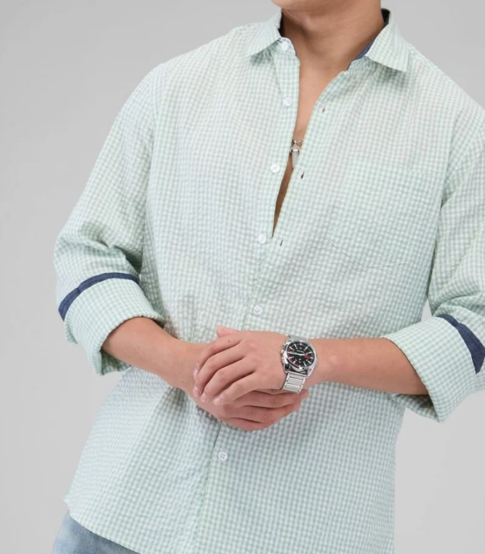 A breezy pastel green check shirt, ideal for summer dressing with a modern relaxed fit.