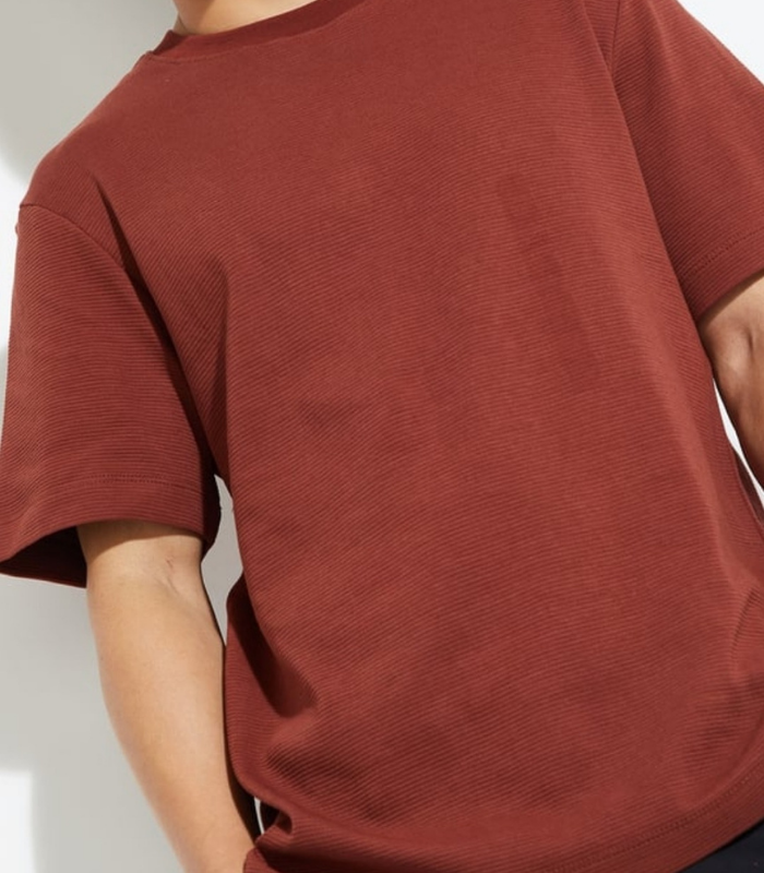 Crafted in a deep brick-red hue with subtle texture, this tee adds warmth and depth to your casual wardrobe.