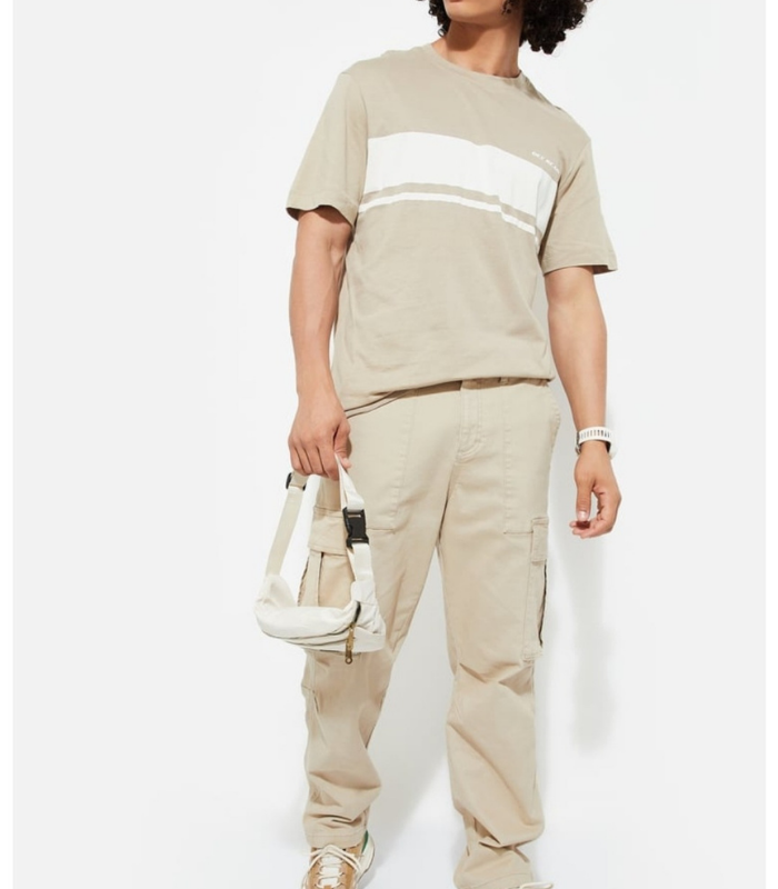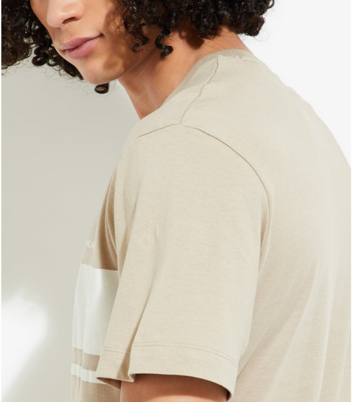 Beige tee with double horizontal white stripe and “Get Ready” text; effortlessly versatile.